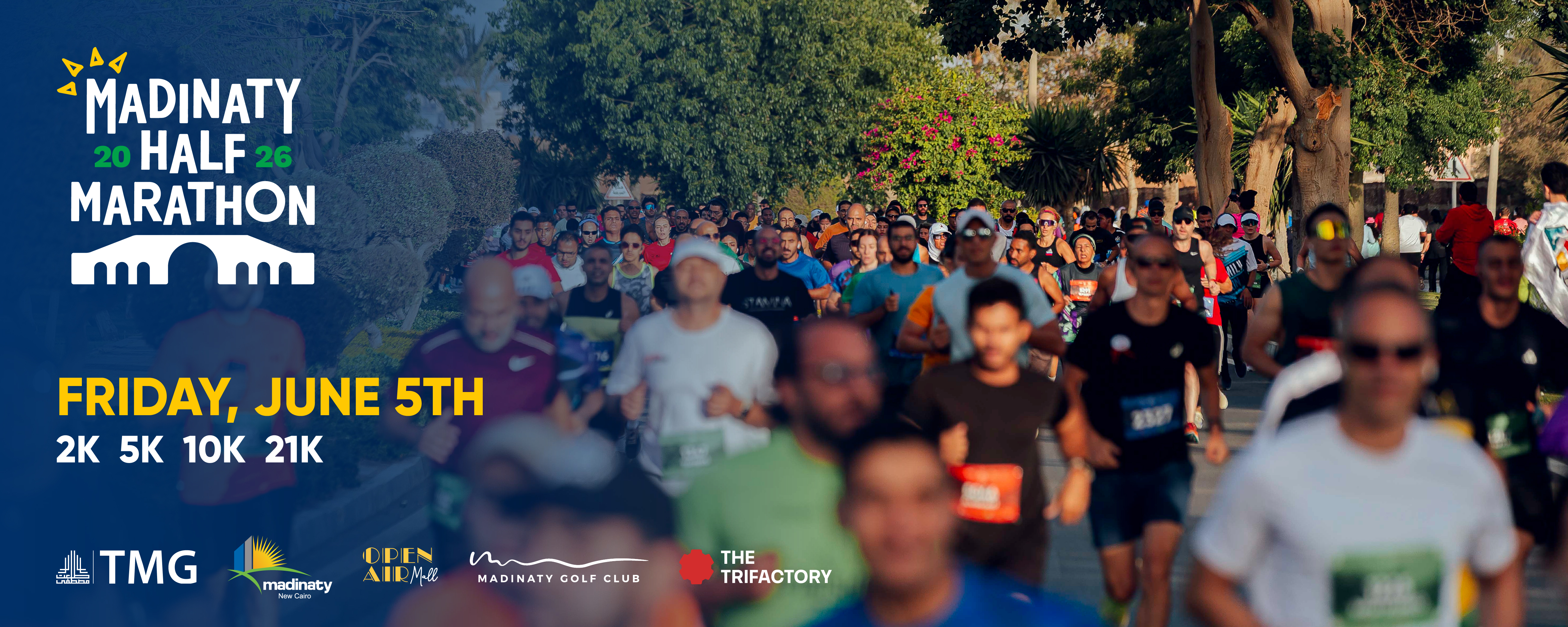 Madinaty Half Marathon is back on Friday, June 5th, 2026, for an exciting sixth edition in the heart of Madinaty! Starting and finishing at the Madinaty Open Air Mall, runners can choose from three main distances: 5K, 10K, and 21K, once more providing a professional-standard race experience, including automatic timing of every runner, fully closed-off roads reserved for runners only, and special race medals at the Finish Line. Families will also be able to participate in a 2K Fun Run which takes place entirely within the Open Air Mall. Madinaty Half Marathon falls under the auspices of the Ministry of Youth & Sports and the supervision of the Egyptian Athletics Federation, and The TriFactory is excited to welcome runners from across Egypt to East Cairo's premier running race!